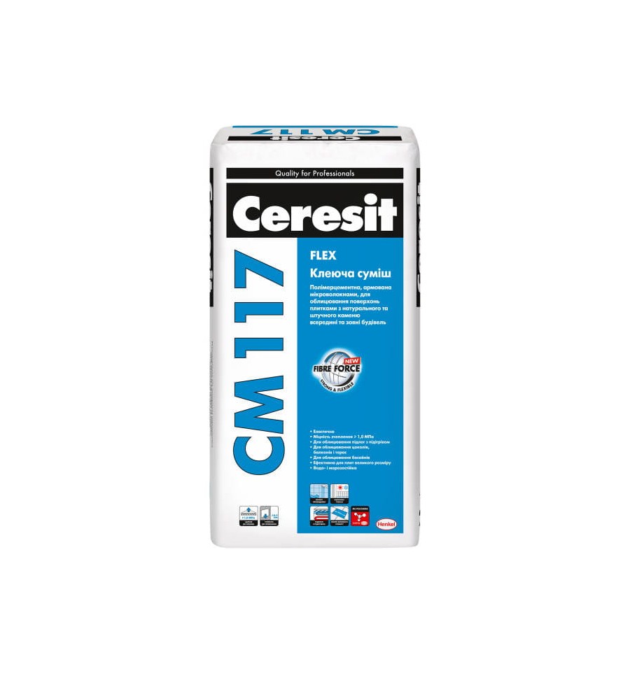 CERESIT CМ 117 — суха суміш для облицювання мінерал. горизонт. і вертикал. поверхонь, в т. ч. тих, що обмежено деформуються (прогин до 2 мм), різними плитками, в т. ч. зі штучного каменю, (розмір ≤ 80х80 см, водопоглинання > 0%) всередині та зовні будівель. Для певних видів основ до Ceresit CМ 117 додають Ceresit СС 83. Ефективна для облицювання басейнів і резервуарів; основ, що зазнають постійних атмосферних впливів та інтенсивних навантажень; методом «плитка по плитці». Див. тех. опис продукту.